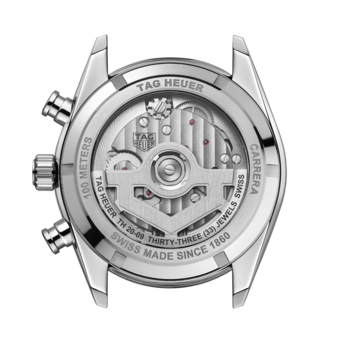 ラグジュアリーは細部に宿ります。パウダーシルバーのロゴマークと「SWISS」、「CARRERA」の文字が、時計の外観を一段と洗練させています。