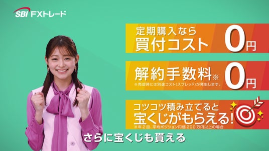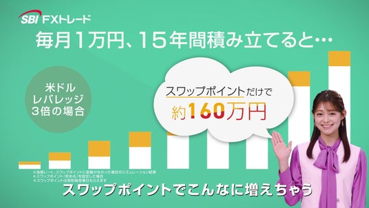SBIホールディングス株式会社(本社:東京都港区、代表取締役会長兼社長:北尾 吉孝)の連結子会社で、個人投資家向けに外国為替取引サービスを提供するSBI FXトレード株式会社(本社:東京都港区、代表取締役社長:藤田 行生)は、当社サービス「つみたて外貨」の新CMの放映を開始いたしました。本CMには、当社のイメージキャラクターである田崎さくらさんを起用しており、外国為替証拠金取引(以下「FX」)の仕組みを活用した当社の積立サービス「つみたて外貨」の魅力をわかりやすくお伝えする内容となっております。