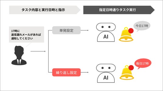 「タスクスケジューラー」は、AIエージェントが設定された時間に指示したタスクを自動的に実行する機能です。指示の内容、実行時間、繰り返し設定を行うだけで、ユーザーがオンラインであるかどうかに関わらず、指定された時間にタスクが実行され、日常的に発生する業務の自動化を実現します。