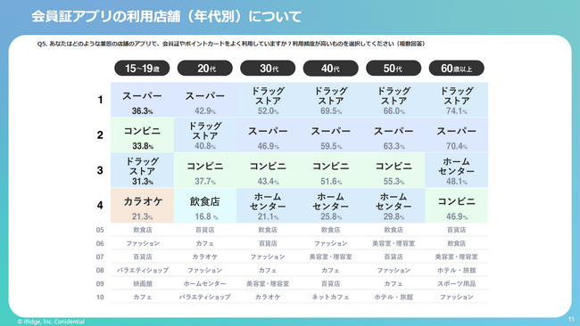 ・学生が多く、まだ消費が活発になる前の10代では初回利用のみの回答も目立った。10代はQ1で「会員証を持っていない」と回答した層も20%おり、よく会員証アプリを利用する店舗ランキングでも、他の年代に比べスーパーやドラッグストアなど生活必需品を提供する店舗の比率が低かった。日常利用する業種の利用比率が低く、ポイントを貯めるという行動が浸透していないことや、関心が低いことも推定される