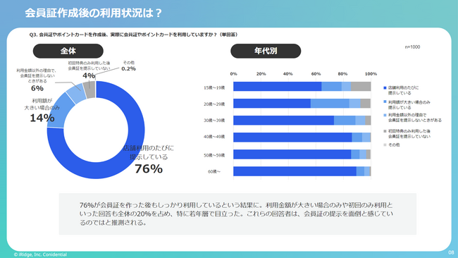 ・76%が一度作成した会員証は毎回提示すると回答。長期的な関係づくりへの有効性が示された