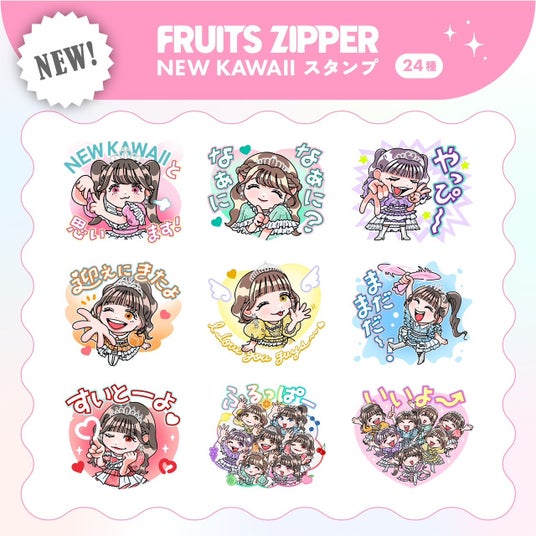 さらに、9月19日(木)11時より、FRUITS ZIPPER 初のLINE公式スタンプ「FRUITS ZIPPER NEW KAWAII スタンプ」が登場。メンバーのボイス付きスタンプとなっており、イラストはイラストレーターのナガミネショウコが描き下ろした。ファンにはおなじみのフレーズが多数使われているほか、日常使いできるワードも盛り込まれている。