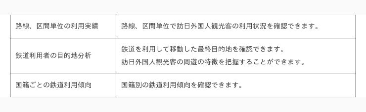 今回の対応により、訪日外国人観光客の鉄道利用パターンを把握できるようになるため、鉄道ネットワークの最適化や観光地周辺の交通対策、サービス向上のための施策検討などに、ご活用いただけます。自治体や交通事業者の方から寄せられていた「鉄道の利用が増えていることは分かっているが、利用者の行動が分からない」「乗車駅や降車駅が知りたい」といった課題に対し、解決の一助となればと思います。