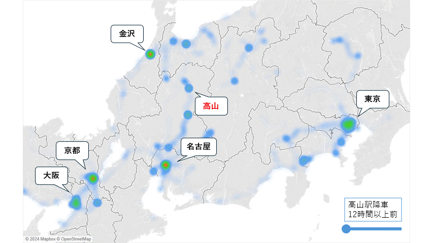 下図は、降車駅を指定し、その前後で旅行者が滞在した場所を地図上に表示したものです。高山駅で降車した旅行者に着目すると以下のことがわかります。