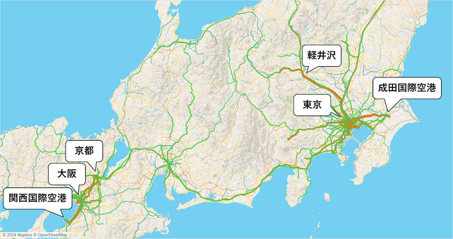 ・関西国際空港⇔大阪⇔京都、成田国際空港⇔東京⇔軽井沢間の利用が多く狭域での周遊が多い