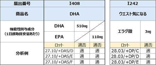 届出番号、商品名、機能性関与成分(1日摂取目安量当たり)および分析結果