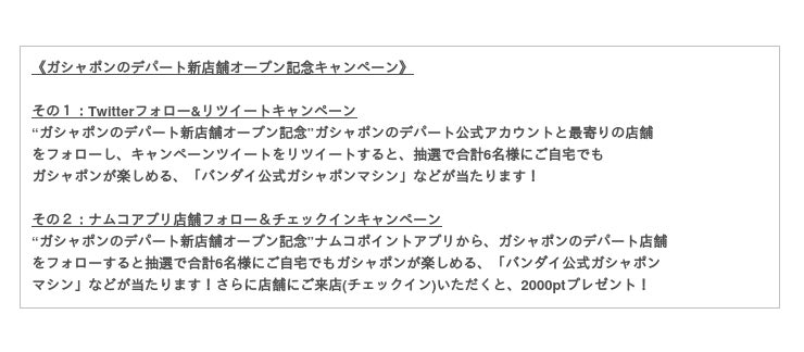 『ガシャポンのデパート』は、バンダイナムコアミューズメントが企画・運営・プロデュースするカプセルトイ専門店で、日頃から新しい商品を探しているカプセルトイファンの”ガシャポン活動(ガシャ活)を豊かにする”をコンセプトに、デパートと呼ぶにふさわしい地域最大級の設置面数と商品構成、知識豊富なスタッフを通してカプセルトイの最新情報を発信し、話題の商品を提案します。