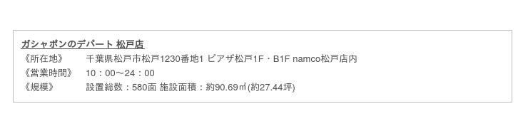 ※コロナウイルス感染拡大防止のため営業時間が異なる場合がございます。詳しくは、namco松戸店公式サイトをご確認ください。https://bandainamco-am.co.jp/game_center/loc/matsudo-tokyogulliver/