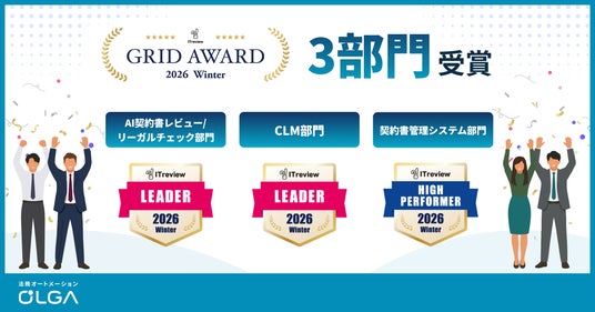 リーガルテックサービスを提供するGVA TECH株式会社(本社:東京都渋谷区、代表取締役:山本 俊、以下GVA TECH)が提供する法務オートメーション「OLGA」は、アイティクラウド株式会社が運営する「ITreview Grid Award 2026 Winter」にて、3部門を受賞したことをお知らせいたします。