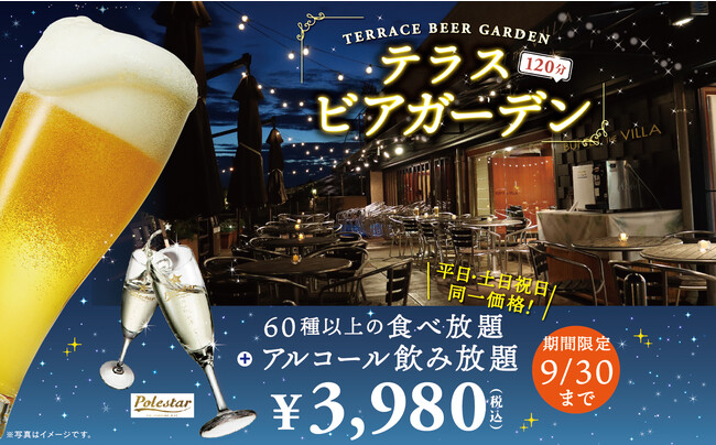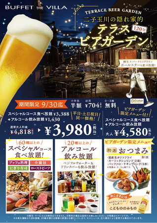 食べ放題のテーマパーク、 ニラックス株式会社(本社:東京都武蔵野市、 代表取締役:崎田 晴義)が運営する『ブッフェ ザ ヴィラ』で期間限定にて開催中の「テラス席限定:ビアガーデン特別プラン」がリーズナブルになって登場!