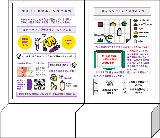また、防災ビンゴラリーのプログラム「どこ逃げクイズ」では、行政と連携し、安全な避難場所に関する情報提供の他、災害時の避難について、クイズを通して考えていただく機会をご提供いたします。