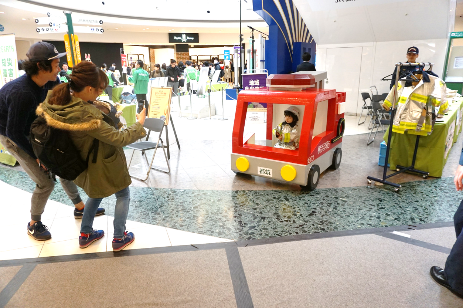 様々な場面で起こる災害にどのように対応すべきか、紙芝居形式のゲームにより楽しく学びます。消防の協力でミニ消防車の展示・防火衣着装体験・AED体験を提供します。