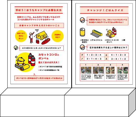 イベント会場内に3種類の防災クイズ(明かりクイズ・ごはんクイズ・どこ逃げクイズ)と災害時のトイレ対応について学べるワークショップが設置されています。参加者は受付でクイズの選択肢が記載されたビンゴシートを受け取りプログラムにチャレンジします。4つの回答を穴あけしていくと、ある合言葉になります。合言葉が正解であれば景品を獲得できます。