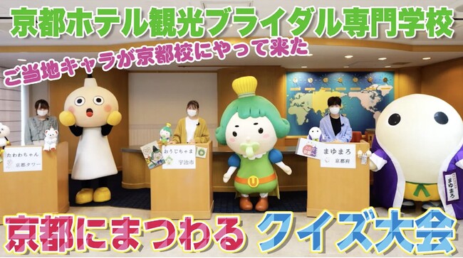 京都ホテル観光ブライダル専門学校に京都のご当地キャラクターの「まゆまろ」「おうじちゃま」「たわわちゃん」が遊びに来てくれました!旅行学科の学生とみんなで京都クイズにも挑戦!あのキャラとも夢の共演!?