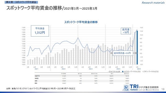 3. スポットワーカーの平均賃金は1,312円。2か月連続で1,300円を超え、過去最高額を更新。