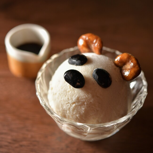 この秋は、マロンクリームとマスカルポーネクリームをグラスの下に敷き、渋皮入りの和栗のアイスクリームで白くまの顔を作っています。