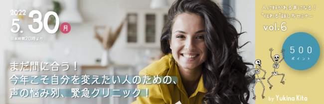 世界中の講師と生徒をつなぐオンライン習い事サイト「カフェトーク(http://cafetalk.com/)」を運営する株式会社スモールブリッジ(本社:東京都渋谷区、代表取締役:橋爪小太郎)は、2022年5月30日(月)20時、声のプロ北如来那講師による「今年こそ自分を変えたい人のための~声の悩み別~緊急クリニック!」オンラインセミナーを開催致します。