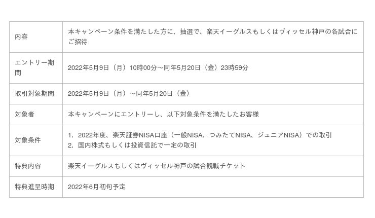 先行して、証券投資とスポーツを身近に感じていただくため、楽天イーグルスもしくはヴィッセル神戸の各試合に抽選で100組200名様をご招待します。2022年のレギュラーシーズン中、楽天証券のお客様のお席をご用意しており、2022年6月以降も本キャンペーンの実施を予定しています。また、今後、さらなる取組みとして、日本国内外のテーマパークチケットやローカルツアー、レストランなどの旅行体験予約サービス「楽天トラベル 観光体験」が提供するオンラインツアーへのご招待や、24時間リアルタイムに予約が取れるオンラインゴルフ場予約サイト「楽天GORA」で利用できるクーポンなどを進呈予定です。各種、取組みやキャンペーンの詳細は、近日中に楽天証券ホームページなどでお知らせしますので、ご確認ください。