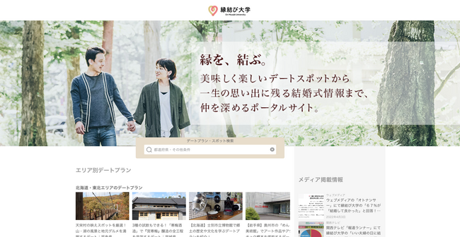『縁を、結ぶ』をテーマにしたデート情報メディア。日本社会の最大の問題ともいえる「少子化問題」の解消に貢献すべく、男女の出会いから結婚までに関する幅広い情報を、きめ細やかな独自取材や、ユーザーアンケートをもとにコンテンツ化し提供しています。