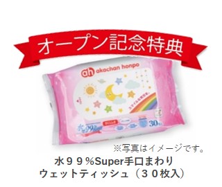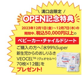 12月1日(金)~12月7日(木)まで期間限定セールを開催します。溝口店だけの特別価格の商品を多数ご用意して、皆さまのご来店をお待ちしております。オープン記念特典として、セール期間中お買上げいただいた方に「水99%Super 手口まわりウェットティッシュ(30枚入)」をプレゼントいたします。( 各日先着200名様限定 ※1家族様1点限り)