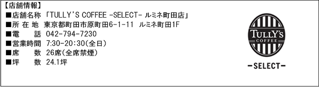 今回オープンする「TULLY’S COFFEE -SELECT- ルミネ町田店」は、ファッションビル「ルミネ町田」の1階に位置します。お買い物の休憩や、お仕事帰りに一息つける場所として、ぜひお立ち寄りください。