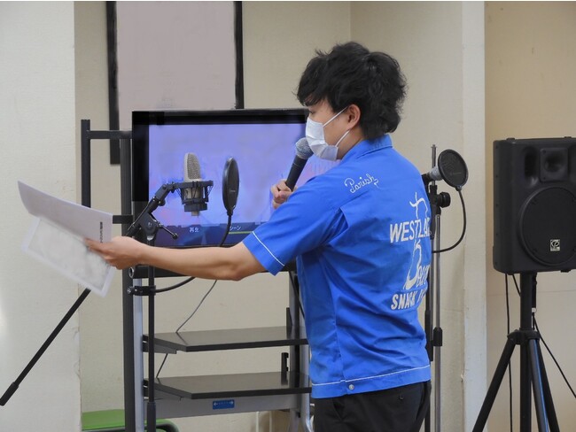 モニターの前にいる在校生が、マイクの誘導や声を入れるタイミングを教えてくれます。また、在校生から積極的に参加者の皆さんへアドバイスやフォローをおこなうので、アフレコ初挑戦の方も安心です。