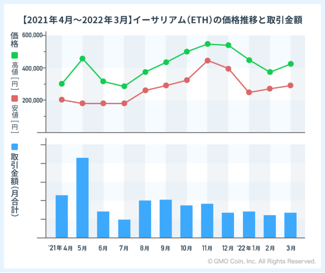イーサリアム(ETH)は2021年11月の最高値更新後大きく価格を下げましたが、3月に入り価格は上昇傾向となっています。取引金額は2021年5月以降減少もしくは横ばいの状態となりました。