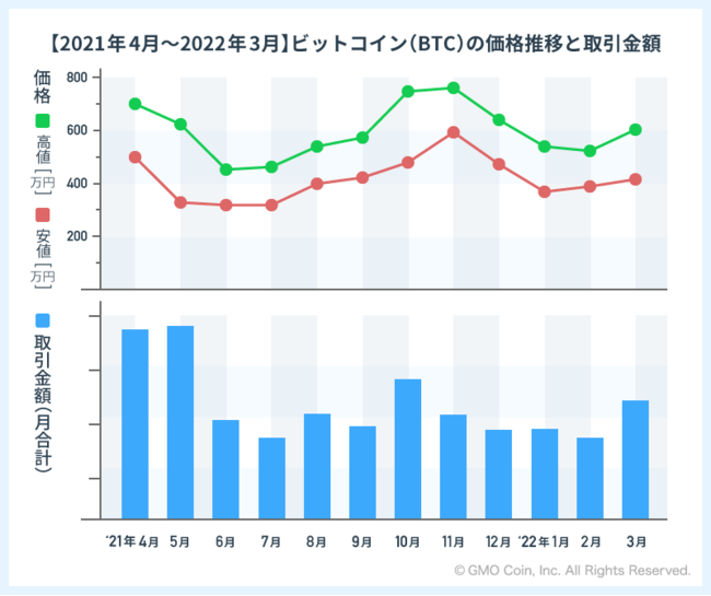 ビットコイン(BTC)は2021年11月の最高値更新後大きく価格を下げましたが、3月に入り価格は上昇傾向で、取引金額もやや増加しました。