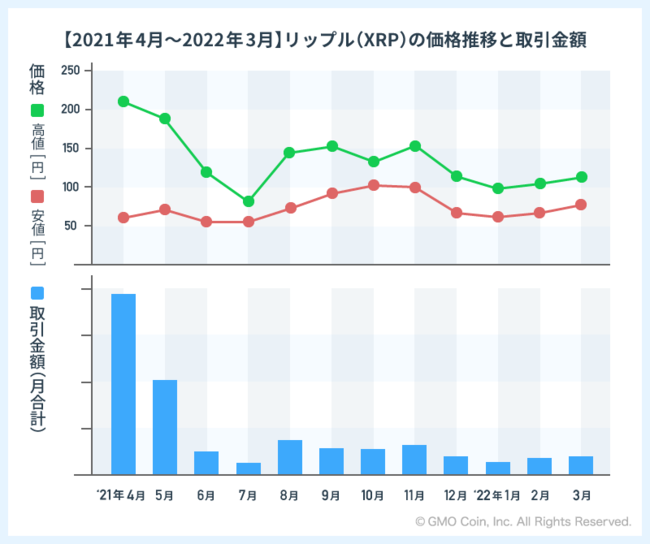 ビットコイン(BTC)、イーサリアム(ETH)、リップル(XRP)の3銘柄の販売所における過去1年間(2021年4月~2022年3月)の価格推移と取引金額をご紹介します。