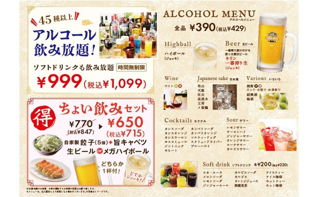 更に、ワイズなら、餃子との相性抜群のビールやハイボールなどのアルコールがすべて全品税抜390円(税込429円)!