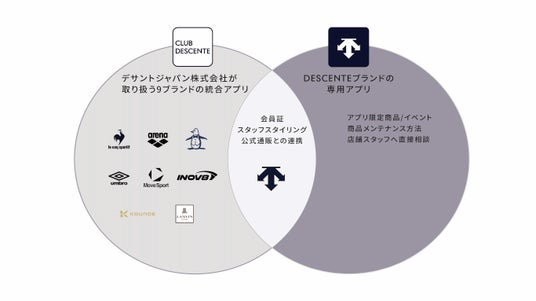 デサントジャパン株式会社は、これまでも『デサント』をはじめ、取り扱う9つのブランドを統合した「CLUB DESCENTE」公式アプリを提供してきました。今回の「DESCENTE専用アプリ」は、デサントジャパン株式会社が提供する2つ目のアプリです。CLUB DESCENTE会員証や公式通販との連携など共通の機能は生かしつつ、新しいアプリでは、より『デサント』ブランドのユーザーに寄り添った情報を発信していきます。