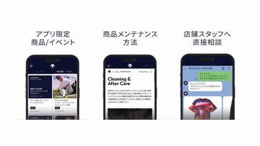 デサントジャパン株式会社は、『デサント』ブランドの新しいアプリケーション「DESCENTE専用アプリ」の配信を開始いたしました。このアプリでは、商品の購入、スタイリング提案はもちろん、アプリ限定商品やイベントの情報、購入いただいた商品のメンテナンス方法など、お楽しみいただける情報をお届けいたします。また、店舗スタッフにLINEでスタイリングなどの相談ができるサービスも開始いたします。