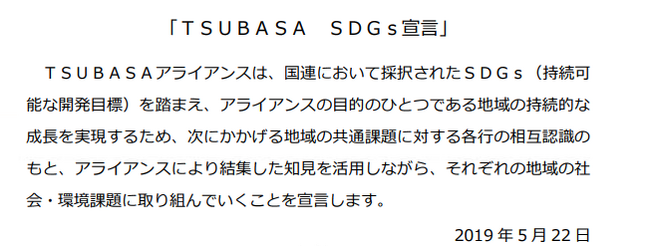 2019年5月には「TSUBASA SDGs宣言」により、地域の共通課題に対する各行の相互認識のもと、アライアンスにより結集した知見を活用しながら、社会・環境問題に取組んでいくことを宣言しています。