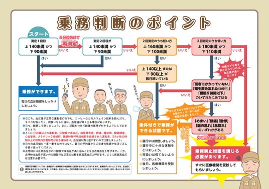 全日本トラック協会より、点呼における血圧測定のガイドラインが配布されています。日々血圧を測定することが推奨され、乗務可否の業務フローも示されています。