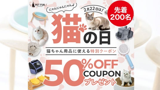 Fun Standard株式会社(本社:福岡県大野城市、代表取締役:大屋良介)が展開するペット用品関連を販売する「PETFUN(ペットファン)」より、猫好きの皆様に向けて、2月22日「猫の日」を記念し、楽天市場にて猫用品の大規模セールを開催いたします。