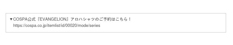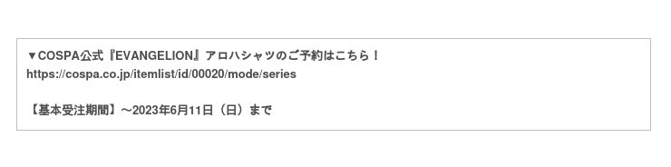 公式キャラクターコスチュームやアパレル・グッズの企画、開発、製造を行う株式会社コスパ(本社:東京都渋谷区、社長:松永芳幸)は、『EVANGELION』より「アロハシャツ」を発売いたします。