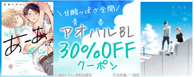 甘酸っぱさ全開! 「auブックパス」では、高校生・大学生がメインで登場する、アオハル・青春系のBL作品を特集いたします。特集内の作品は、BL好き書店員が厳選。イジワルゆるチャラ男子×恋愛に不器用で一途な優等生の『なんかもうあーあって感じ。』や、男子高校生2人が紡ぐ眩しくて愛しい青春劇『君は夏のなか』など、爽やかな作品を集めているので、BL初心者の方にも読みやすくておすすめです。また、対象作品に使える30%OFFクーポンを期間限定で配布中です。