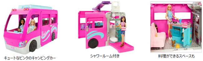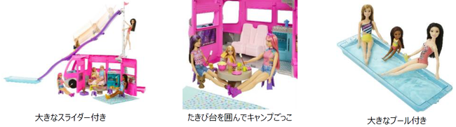大きなスライダーと、プール、たきび台など7つのプレイエリアと60種類以上のアイテムがついたキュートなピンク色のキャンピングカーです。実際に動く車輪が付いているのでキャンピングカーを走らせて遊ぶことができるのはもちろん、たきび台やマシュマロスティックなどのアイテムを使用して、たきび付きのキャンプごっこを楽しむこともできます。また、ドールをはしごに登らせ、大きなスライダーからプールにすべらせると、水しぶきを上げることができます。その他2匹のペットの子犬や、家具、キッチンツール、やわらかな毛布などのアクセサリーで、様々なシチュエーションを再現してお子さまの想像力を掻き立てます。