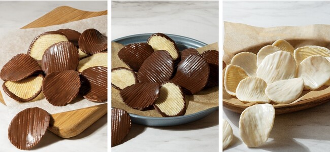 ベルギー産のまろやかなミルクチョコレートをコーティングした「ポテトチップス チョコレート ミルク」、ベルギー産カカオ分56%の香り豊かなダークチョコレートをコーティングした「ポテトチップス チョコレート ダーク」、ベルギー産のホワイトチョコレートをコーティングした「ポテトチップス チョコレート ホワイト」は、いずれも塩味と甘味の絶妙なバランスが、とまらない美味しさです。