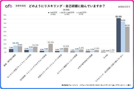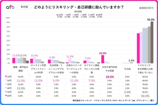 アフィリエイトプラットフォーム「afb(アフィビー)」< https://www.afi-b.com/ >の開発運用をおこなう株式会社フォーイットは、全国の10代~60代までの男女500人を対象にリスキリング・自己研鑽に関するアンケートを実施し、年代別等の特徴についてまとめました。