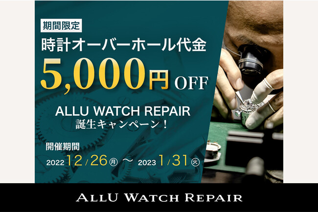 地球、そして私たちのために循環をデザインする「Circular Design for the Earth and Us」をパーパスに掲げ、大切なことにフォーカスして生きる人を増やすことを目指すバリュエンスジャパン株式会社(本社:東京都港区、代表:六車 進、以下 当社)は、「ALLU WATCH REPAIR」の時計修理サービスにおいて、2022年12月26日(月)~2023年1月31日(火)の期間中、オーバーホール料金が5,000円引きになる「ALLU WATCH REPAIR 誕生キャンペーン」(URL:https://nanboya.com/watch-repair/event_alluwatchrepair/ )を開催いたします。