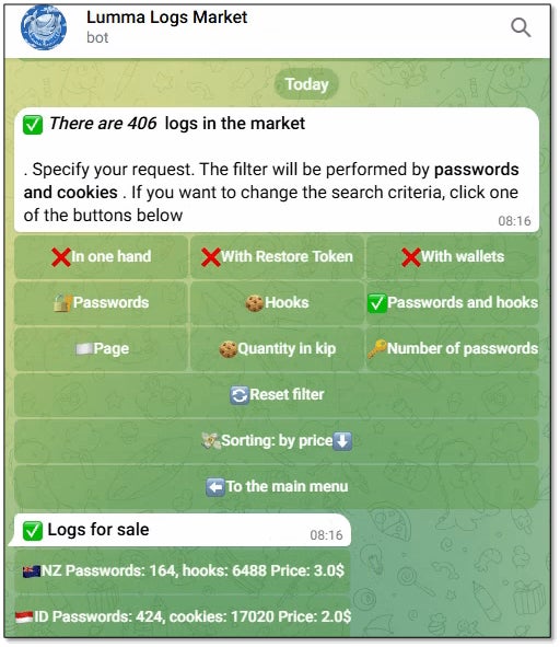 Lummaインフォスティーラーが完全に停止していないことを示すもうひとつのサインとして、侵害されたコンピューターから窃取された情報がオンライン市場に出回り続けているという事実があります。例えば、摘発作戦の2日後、Lummaによって窃取された認証情報を販売する自動化されたテレグラムボットが、41カ国から集めた95件のログを売りに出していました。5月29日時点で、同ボットには406件のログが掲載されており、着実に増加していることが確認されています。
