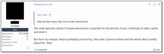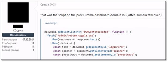 Lummaの摘発作戦では、法執行機関 はLummaのメインのテレグラムチャンネルにメッセージを投稿し、管理者とアフィリエイトがすでに当局に情報を提供していると主張しました。また、乗っ取られた管理パネルに仕込まれたJavaScriptスニペットは、利用者のウェブカメラで写真を撮影すると称していましたが、これも心理的な揺さぶりだった可能性があります。実際、脅威アクターたちがこのJavaScriptのコードを詳細に分析したところ、コードは非常に初歩的で正常に動作しないものだったことが判明しています。