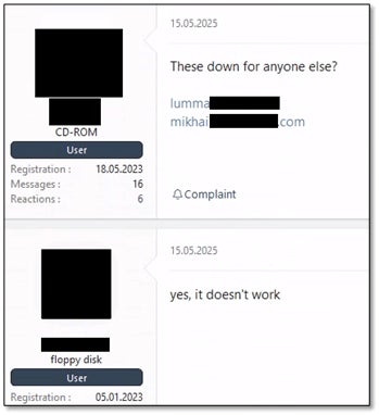 関係者によると、このテイクダウン作戦は5月15日に開始されました。その日、Lummaの顧客は、マルウェアのC2サーバーや管理ダッシュボードにアクセスできないと訴え、このインフォスティーラーの宣伝をしているダークウェブフォーラムに殺到しました。