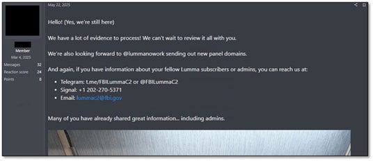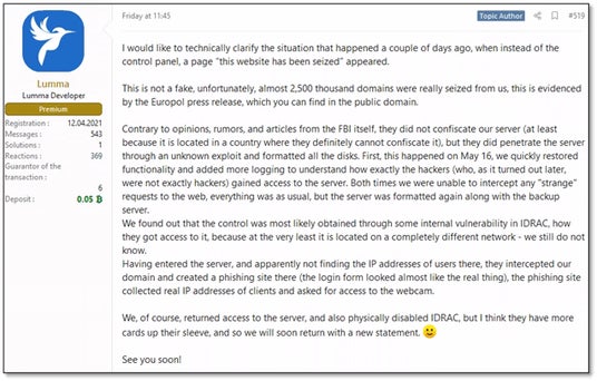 Lummaの開発者は、5月23日金曜日に公式回答を発表しました。その内容は、Lummaのドメインのうち約2,500個が法執行機関によって押収または削除されたことを認めるものでした。
