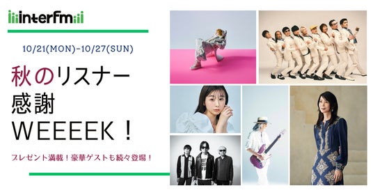interfm(東京:89.7MHz 横浜:76.5 MHz)は、10月21日(月)~10月27日(日)までの1週間、「秋のリスナー感謝WEEEEK!」を開催します。リスナーへの感謝を込めて、各ワイド番組で豪華プレゼントやスペシャルな企画を実施するほか、豪華ゲストも続々登場します。どうぞ、お楽しみに。