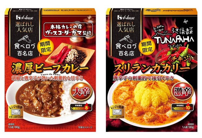 ハウス食品は「選ばれし人気店」シリーズより、大阪・高槻にある「ヴァスコ・ダ・ガマ」監修の<濃厚ビーフカレー 大辛>、福岡にある「ツナパハ」監修の<スリランカカリー チキン 激辛>を、5月15日からスーパーなどで期間・数量限定で発売します。