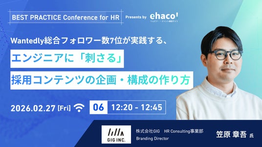 株式会社GIG(本社:東京都中央区、代表取締役:岩上貴洋、以下GIG)は、2026年2月27日(金)に開催される株式会社フラグアウト ehaco!運営事務局主催のカンファレンス「AI時代におけるITエンジニア採用と組織づくりの最適解」に登壇することをお知らせいたします。