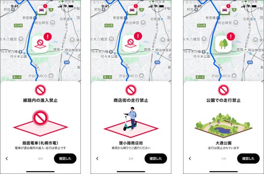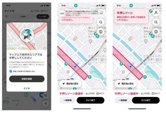 降りて手押しをしなければいけない乗車禁止エリアに入ると当該通知をアプリ上で表示します。