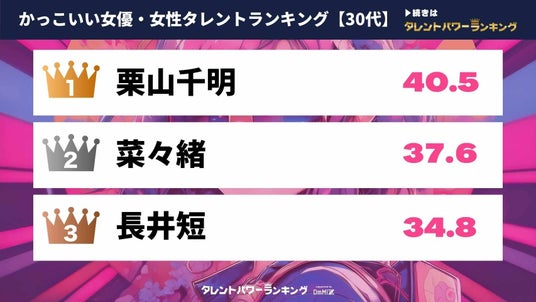 30代では、ハリウッドやファッションシーンでも活躍しており、フジテレビ系ドラマ「大奥(2024年)」に出演し、2024年6月にシーズン3がスタートしたテレビ東京系ドラマ「晩酌の流儀」シリーズでは主演を務めている女優がランクイン。